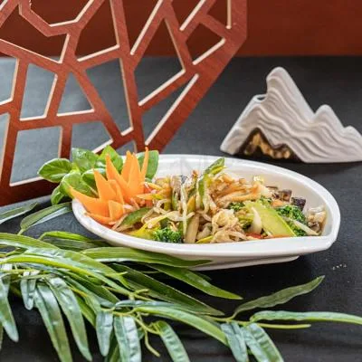 poulet, vermicelles, oignons fins, champignons chinois, carottes, bambou et huile de sésame | ||