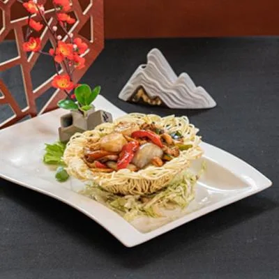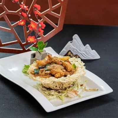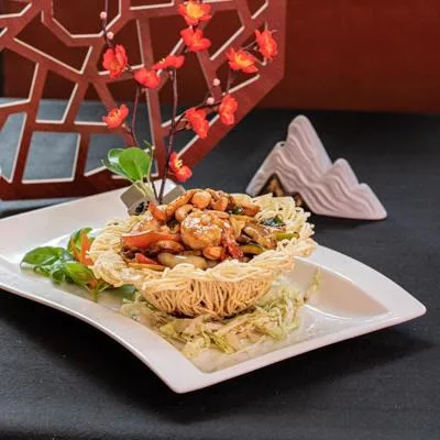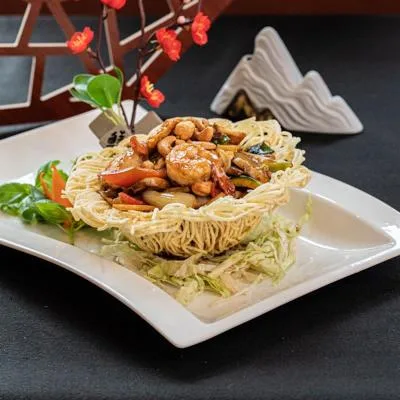 poulet, oignons fins, oeuf, champignons noirs, bambou, paprika et huile de sésame | ||