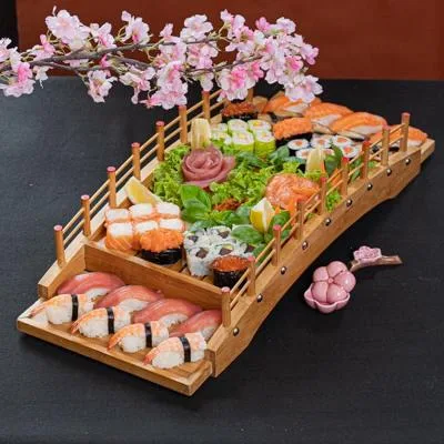 56 pièces - 6pcs maki saumon rolls cheese (philadelphia), 6pcs soja rolls crevette mangue, 6pcs california thon avocat, 6pcs maki saumon, 6pcs sashimi saumon, 6pcs sashimi thon, 4pcs nigiri saumon, 4pcs nigiri thon, 4pcs nigiri crevette, 4pcs nigiri anguille, 2pcs sakura oeufs de saumon et 2pcs tartare de saumon | ||