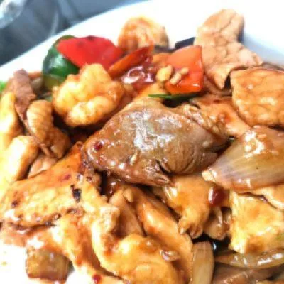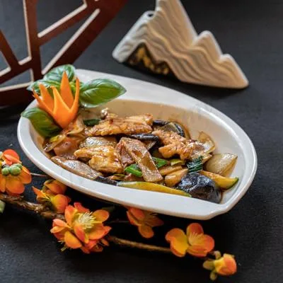 aubergines, porc haché, scampi, oignons fins et sauce piquante | ||