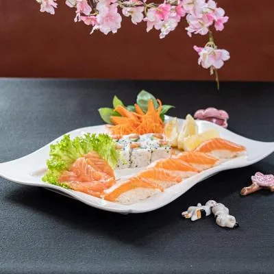 16 pièces - 5pcs nigiri saumon, 5pcs sashimi saumon et 6pcs california saumon avocat | ||