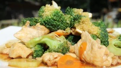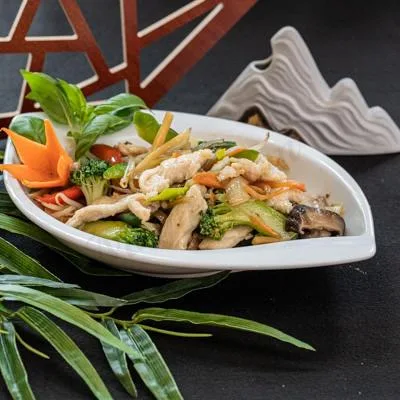 poulet, champignons chinois, carottes, oignons fins et huile de sésame | ||