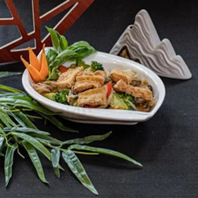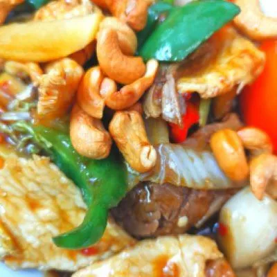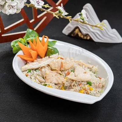 poulet, tomates, oignons fins, petits pois, champignons et huile de sésame | ||