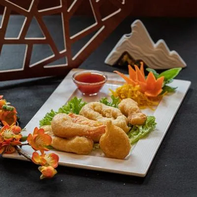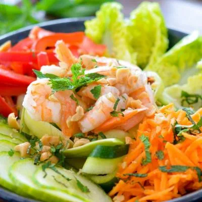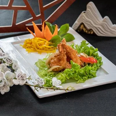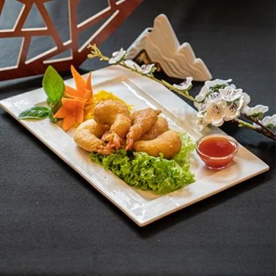 6 pièces scampi, salade verte, maïs, oignons, carottes, concombres, tomates et sauce blanche à base de mayonnaise | ||